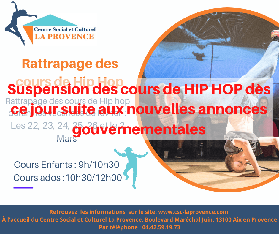 C'est de nouveau avec beaucoup de tristesse, que nous sommes dans l'obligation de suspendre les cours de HIP HOP dès ce jour.